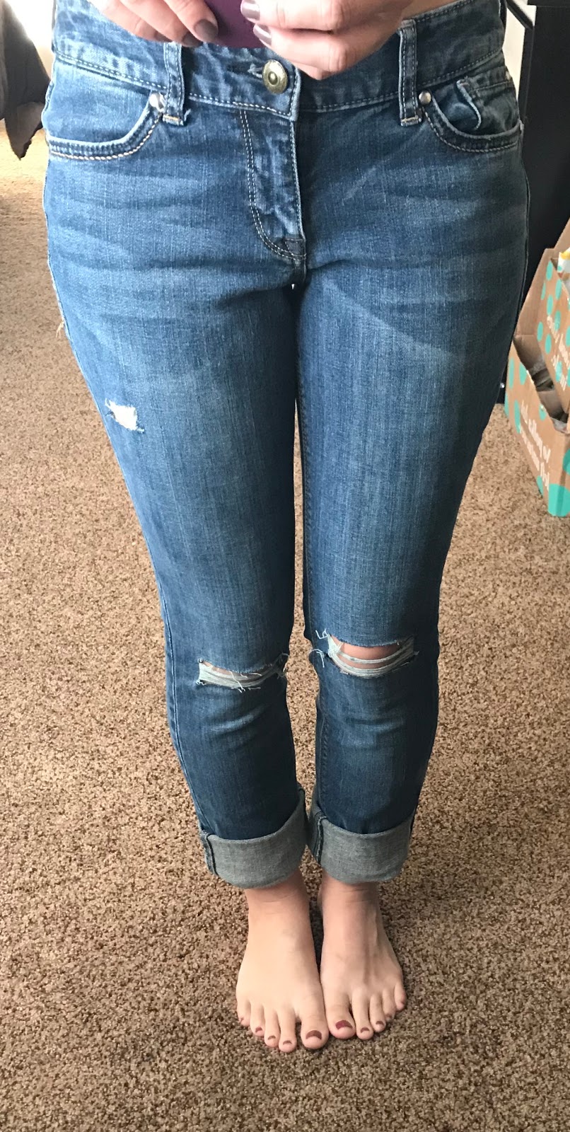 Step 1: Pick out a pair of jeans that you want to distress. I would go for an older pair or a cheaper pair of jeans that you wouldn’t mind if you messed up. The jeans I picked for this post are a pair of Express jeans that I’ve had in my closet for probably 10 years. They needed a makeover! I recommend that you do some research first on what style of distressed jeans you want. I personally don’t like too many holes, so I kept it simple with 2 holes on the knee and a small hole on the upper leg on one side.