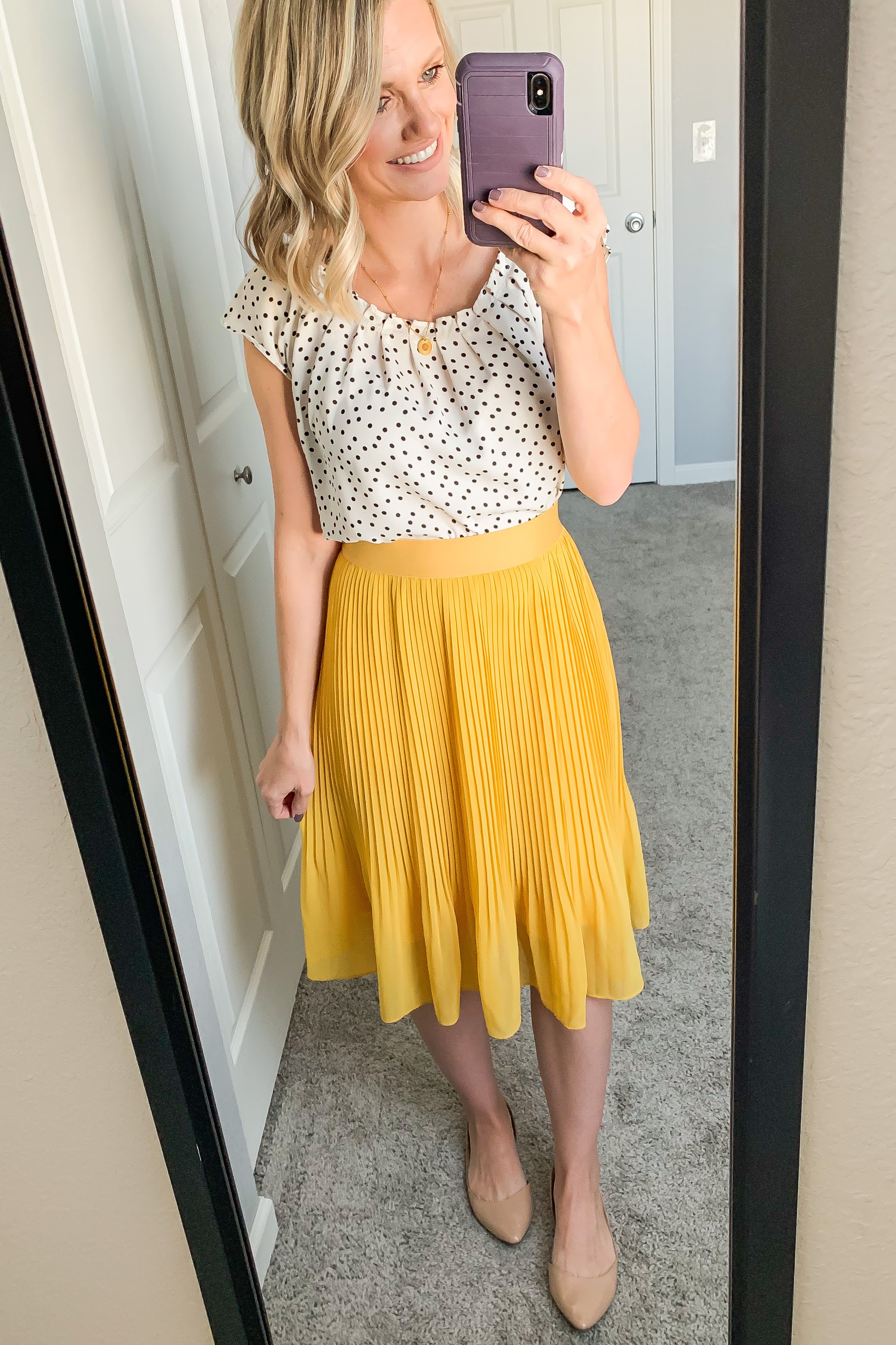 I’ve been loving pleated skirts lately. A few months ago I found this yellow pleated skirt at ThredUP and I’ve been dying to share it on the blog. I’m also dying to actually wear it somewhere. I think that it would be the perfect teacher skirt. It makes me want to go out and get a new teaching job just so I can wear this skirt. But since I’m not going to actually do that, I guess I will share it with all of you incase you are looking for a little work wear inspiration.